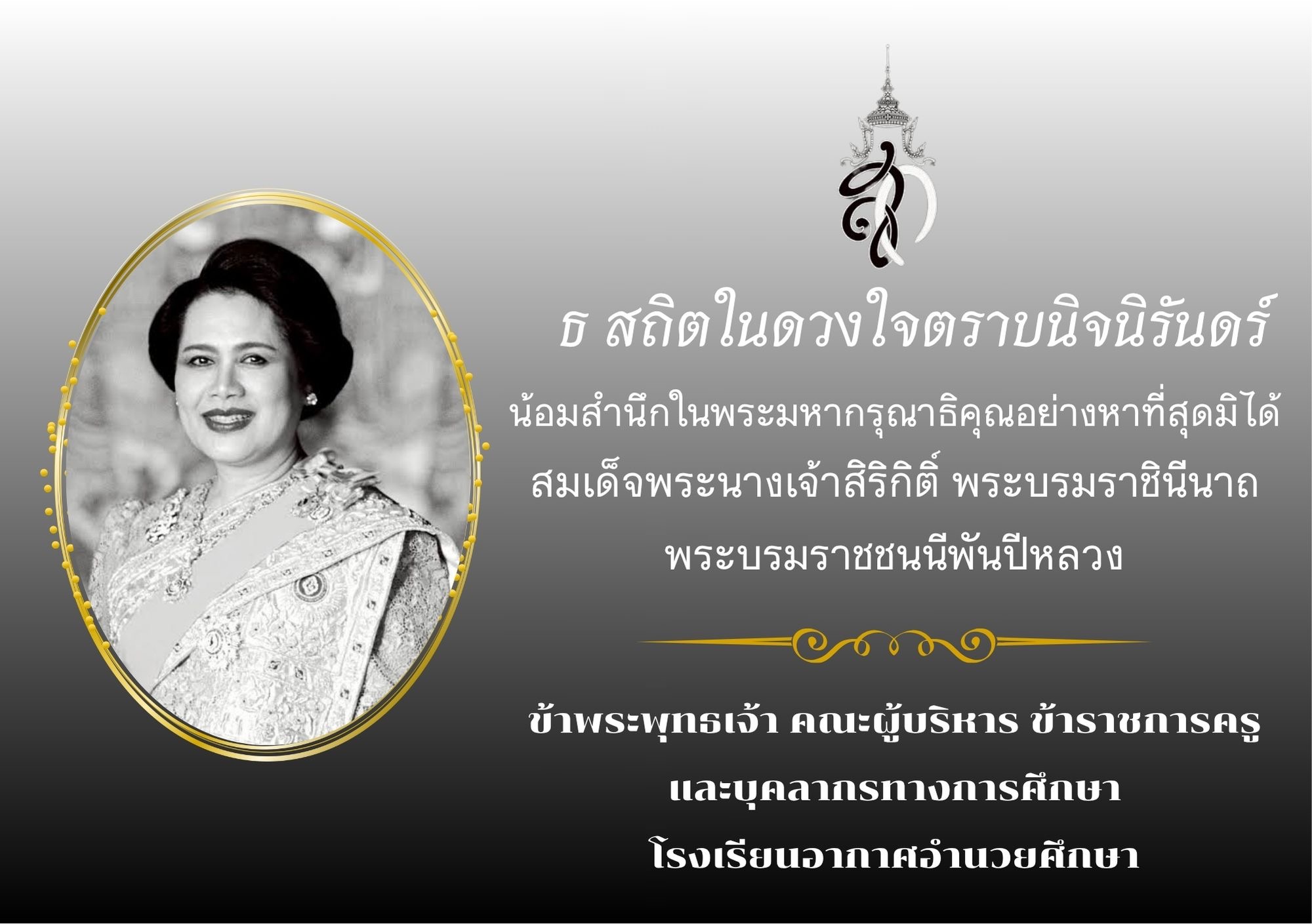 สถิตอยู่ในดวงใจปวงชนชาวไทยชั่วนิรันดร์ น้อมส่งเสด็จสู่สวรรคาลัย น้อมรำลึกถึงพระมหากรุณาธิคุณเป็นล้นพ้นอันหาที่สุดมิได้