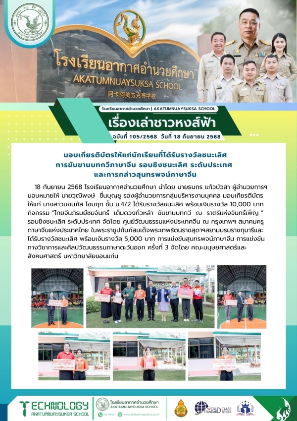 มอบเกียรติบัตรให้แก่นักเรียนที่ได้รับรางวัลชนะเลิศ การขับขานบทกวีภาษาจีน รอบชิงชนะเลิศ ระดับประเทศ และการกล่าวสุนทรพจน์ภาษาจีน by adminPosted on 18 กันยายน 2025