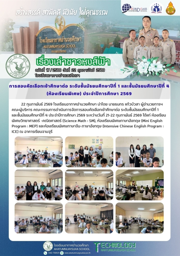 การสอบคัดเลือกเข้าศึกษาต่อ ระดับชั้นมัธยมศึกษาปีที่ 1 และชั้นมัธยมศึกษาปีที่ 4 (ห้องเรียนพิเศษ) ประจำปีการศึกษา 2569 by adminPosted on 22 กุมภาพันธ์ 2026