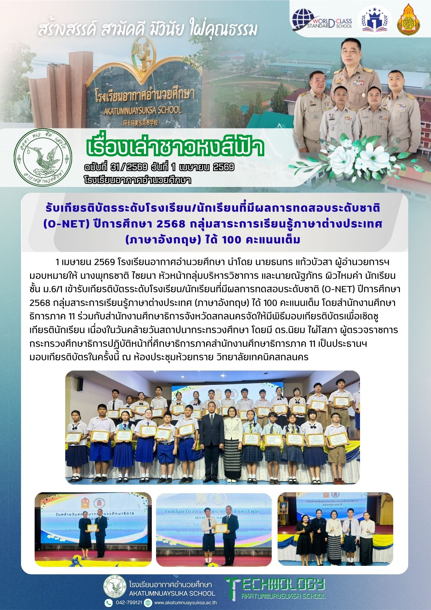 รับเกียรติบัตรระดับโรงเรียน/นักเรียนที่มีผลการทดสอบระดับชาติ (O-NET) ปีการศึกษา 2568 กลุ่มสาระการเรียนรู้ภาษาต่างประเทศ (ภาษาอังกฤษ) ได้ 100 คะแนนเต็ม